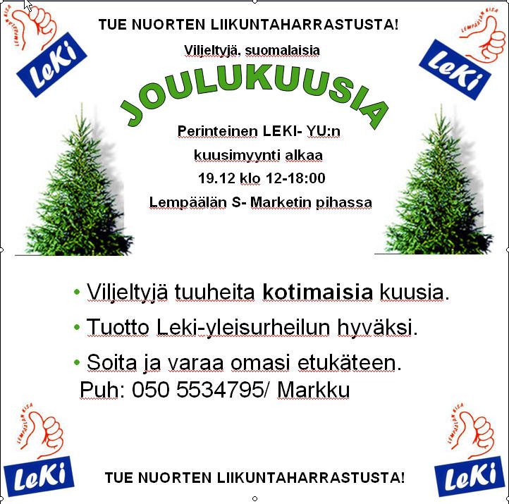 Perinteinen Kisan yleisurheilun joulukuusimyynti alkaa Lempäälän S-marketin pihassa la 19.12 klo 12:00. Kuusia myydään 19-23.12 klo 12:00 - 18:00 välisenä aikana niin kauan kuin kuusia riittää. Kuuset ovat viljeltyjä tuuheita ja kotimaisia. Tuotto menee kokonaisuudessaan Leki-yu:n hyväksi. Tule ja tue nuorten liikuntaharrastusta. Voit myös varata omasi etukäteen numerosta 050 5534795/Markku.